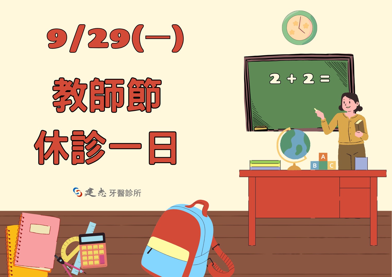 建志牙醫將於教師節隔天9/29(一)補假一天,敬請留意以下看診時程: