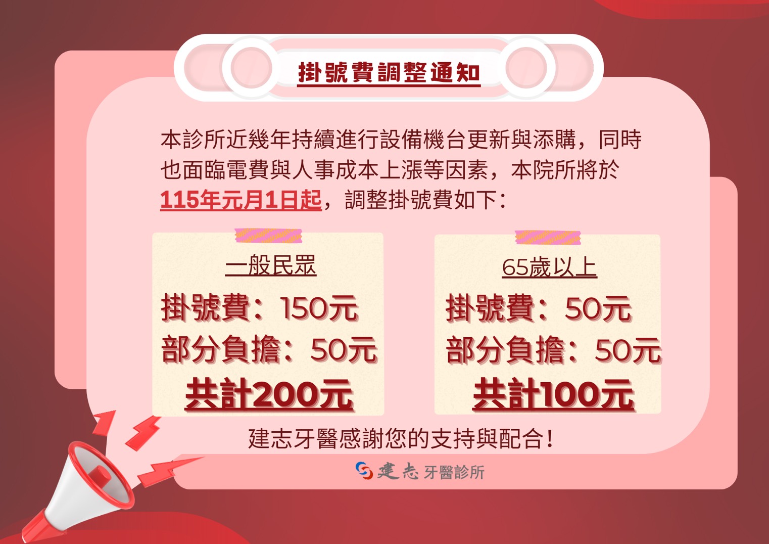我們理解這項調整可能會帶來些許不便,誠摯感謝您的體諒與支持。建志牙醫診所全體醫療團隊將持續以專業與用心,守護您與家人的口腔健康。